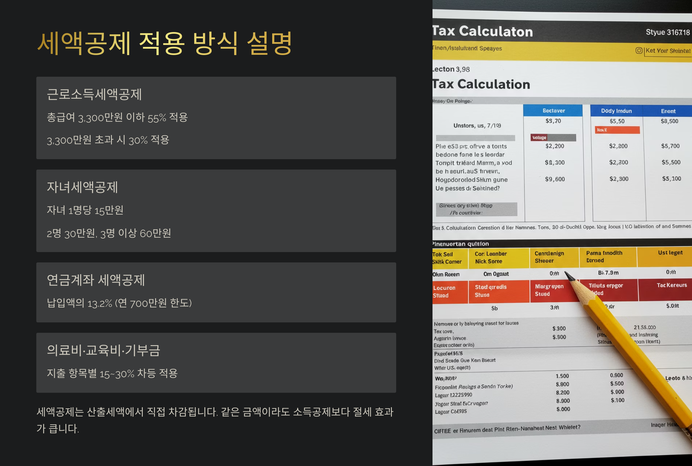세액공제는 소득세 계산 후 세액에서 직접 빼주는 공제예요. 주요 세액공제는 다음과 같아요: