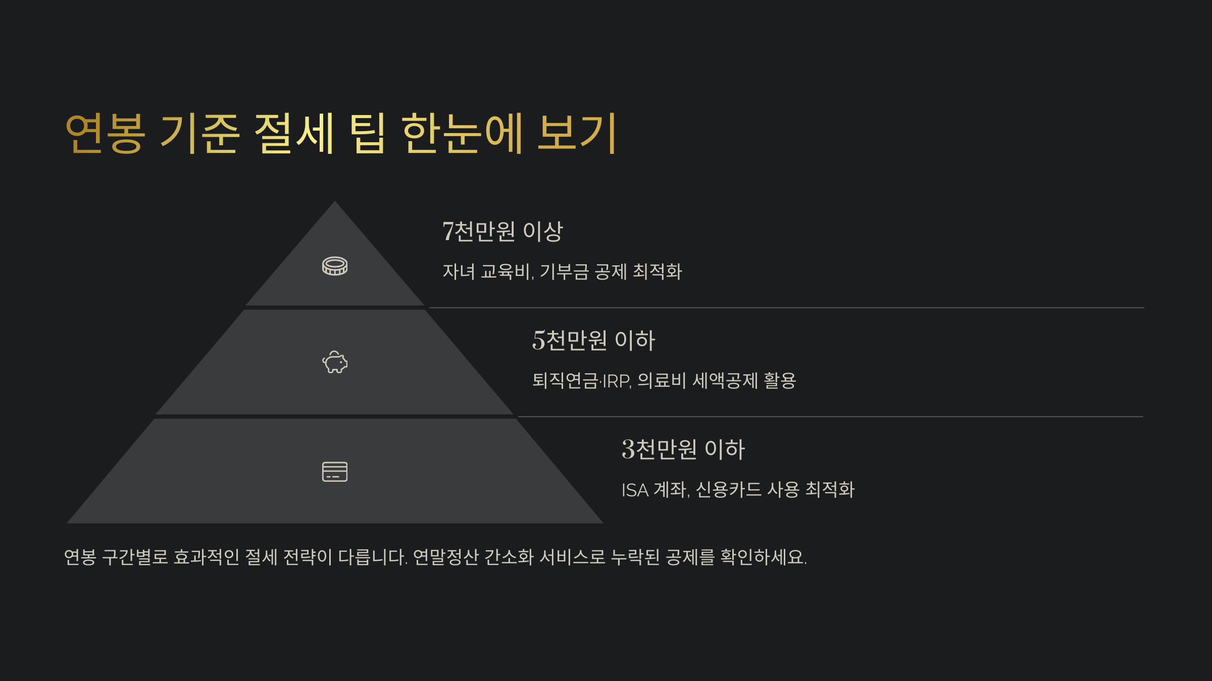 | 절세 팁 | 연봉별 공제 활용 | 세무사 상의 |